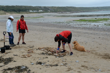 Our annual beach sculpture festival, now in its 13th year,continued its third day at Port Eynon Bay, the most southerly point of the Gower Peninsula. The previous two days of beautiful sunny weather was replaced with a wet and windy start to the day. Eventually the bad weather subsided somewhat and the artists descended on the beach to begin making some sculptures. They were soon joined by holiday makers and locals determined to make the most of their summer holidays, despite the unseasonable weather. People enjoyed the element of surprise on arrival at the beach to find some inspiring sculptures and responded with great enthusiasm as the skies cleared from the morning rain. There is always something quite exciting about getting out after a storm - to see what might have been washed up on the beach and to relieve the cabin fever! People were really enthusiastic and were really inspired by what the artists had already created in the rain. It gave them real confidence to see what could be made from a few found materials. An environmental awareness was achieved by the artists in many ways - e.g. teaching the names of shells and sea creatures, backed up with fact sheets about British marine life. It was a great festival event after the rain..a lovely busy bustling afternoon with lots of people enjoying being creative on the beach.ach to find wonderful sculpures. |