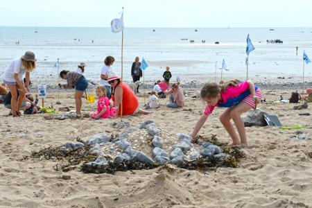 Families enjoyed working together to make different sculptures such as leatherback turtles, octopusses, fishes, seahorses,etc. using materials found on the beach such as sand, shells and pebbles. |